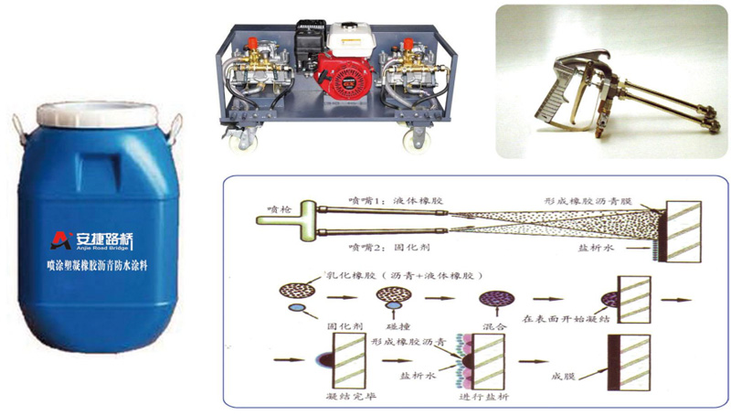 噴涂速凝橡膠瀝青防水涂料是采用特殊工藝將超細懸浮微乳型陰離子改性乳化瀝青和合成高分子聚合物( A組份)與特種成膜劑( B組份)混合后生成的高彈性防水、防腐、防滲、防護涂膜的防水涂料。經現場專用設備噴涂瞬間形成致密、連續、完整的并具有極高伸長率、超強彈性、優異耐久性的,真正實現"皮膚式”防水的防水涂膜,是一種施工簡便快捷、能夠系統解決防水問題的節能減排產品。該產品具備的優異性能與科學施工工藝的有效結合,大限度地使材料性能和工程質量得以完美體現和保障,積極地推進了新技術、新工藝、新材料、新設備的使用。